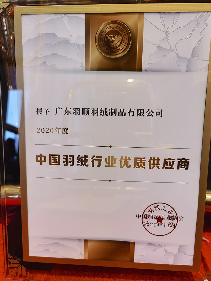 热烈祝贺广东羽顺羽绒制品有限公司被评为中国羽绒行业优质供应商