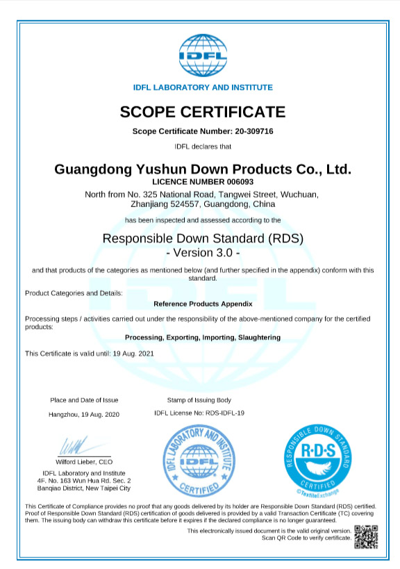 祝贺广东羽顺羽绒制品有限公司通过RDS认证