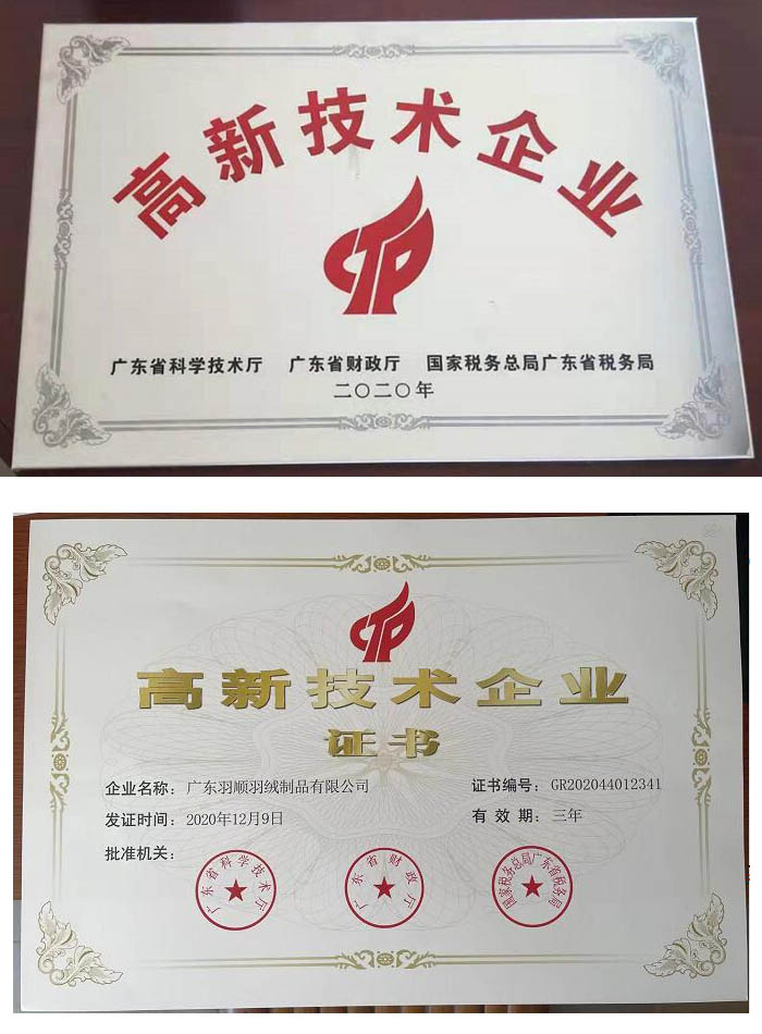 广东羽顺羽绒制品有限公司被评为高新技术企业